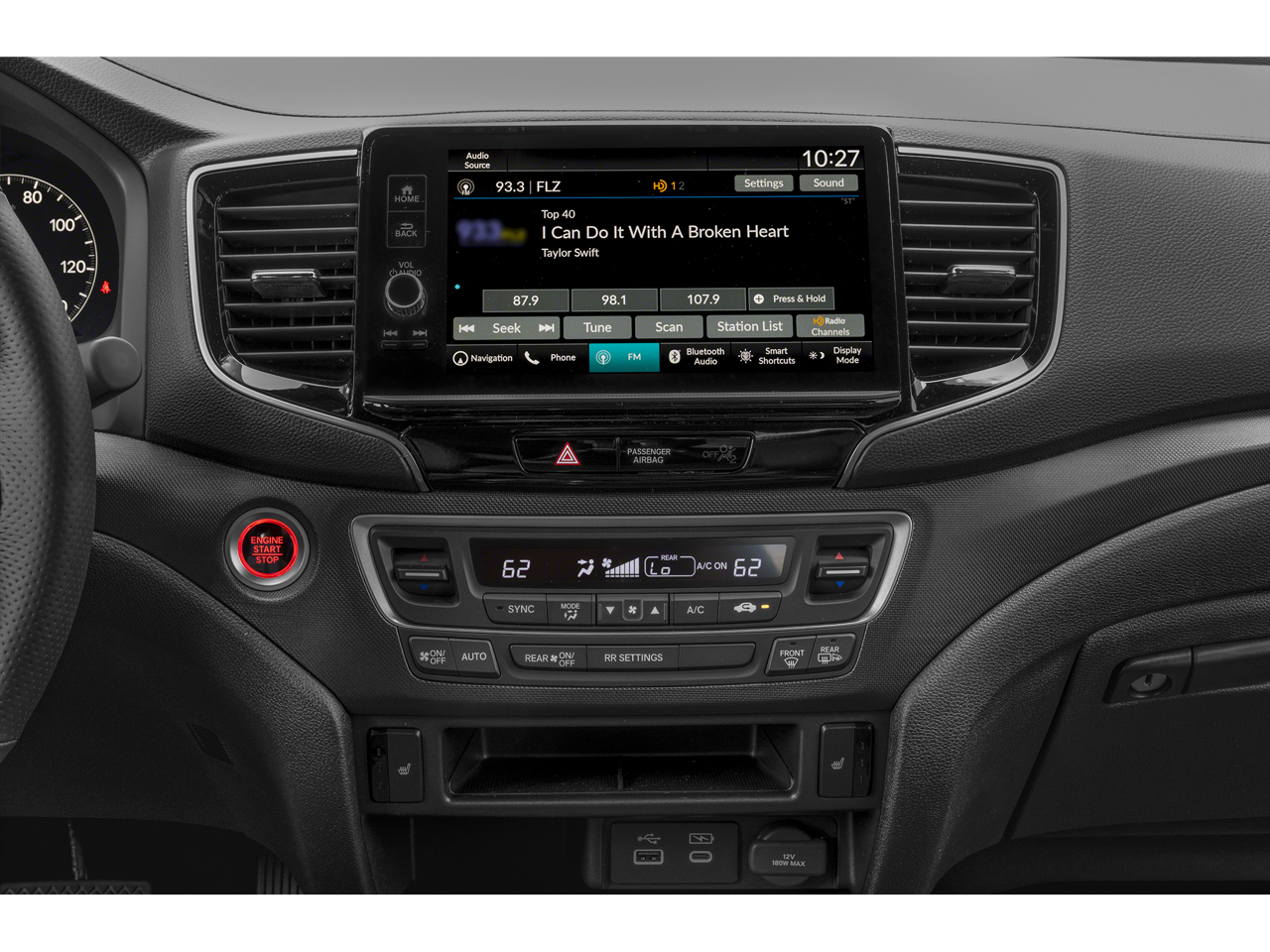 - Radio: 215-Watt Audio System w/7 Speakers -inc: subwoofer, 9" color touchscreen, Bluetooth streaming audio, Speed-Sensitive Volume Compensation (SVC), wireless Apple CarPlay/Android Auto compatibility, 2.5A USB-A data port in front console, 3.0A USB-C charging port in front console and HondaLink